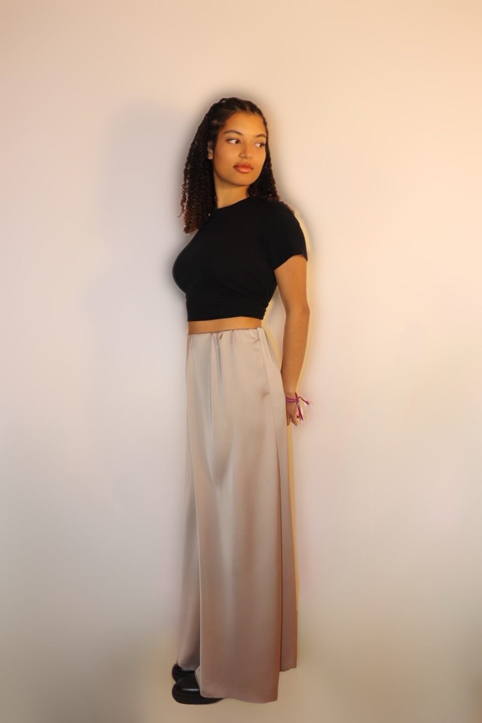 Jupe longue en satin couleur taupe à la coup fluide et élégante. Sa taille élastique s’adapte parfaitement à différentes morphologies grâce à sa ceinture extensible.