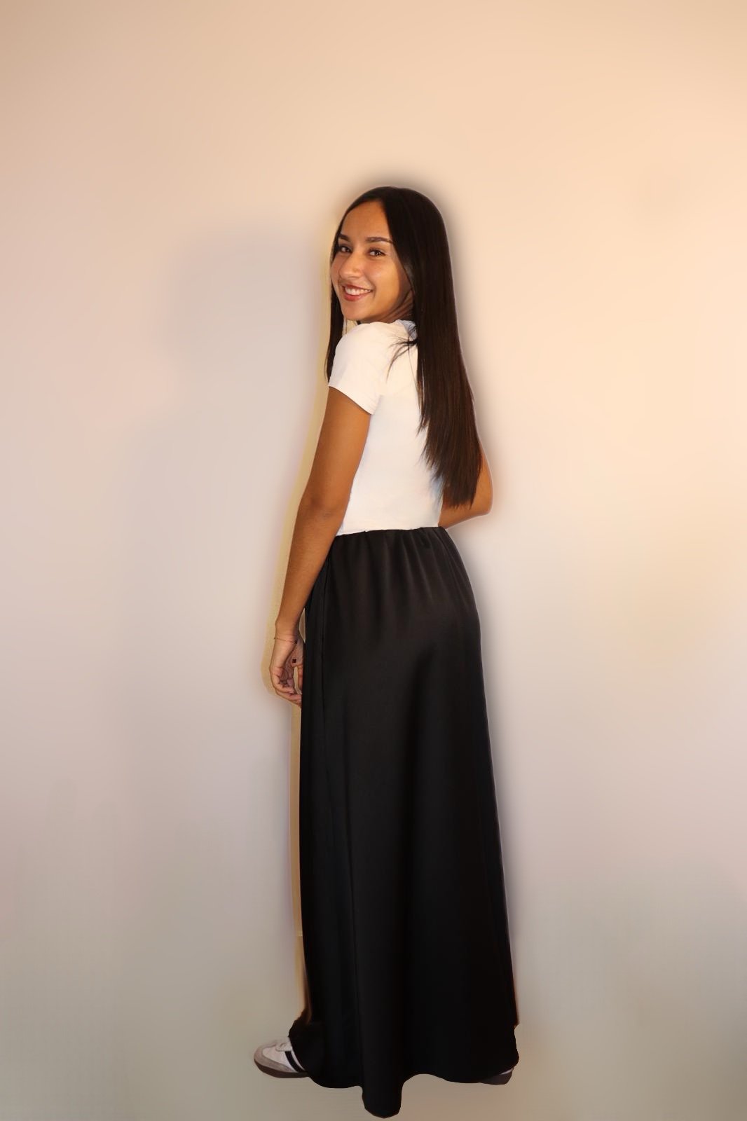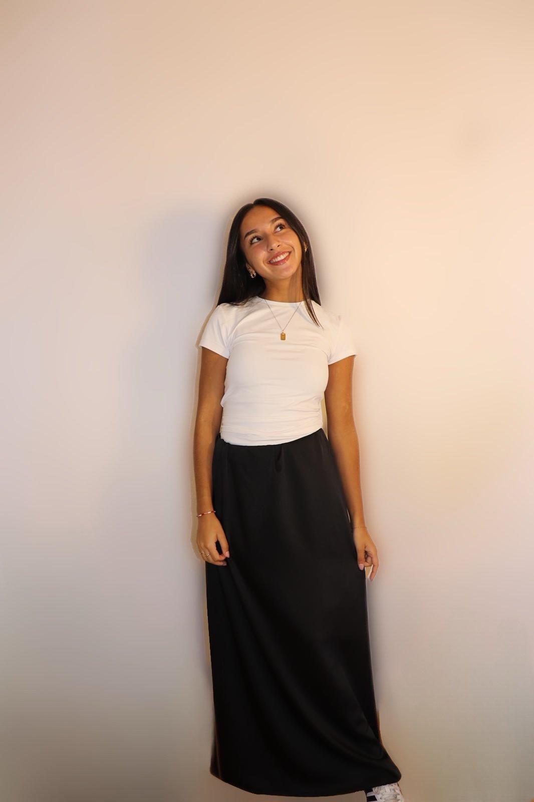 Jupe longue noire en satin à la coupe fluide et élégante. Sa taille élastique s’adapte parfaitement à différentes morphologies grâce a sa ceinture extensible.