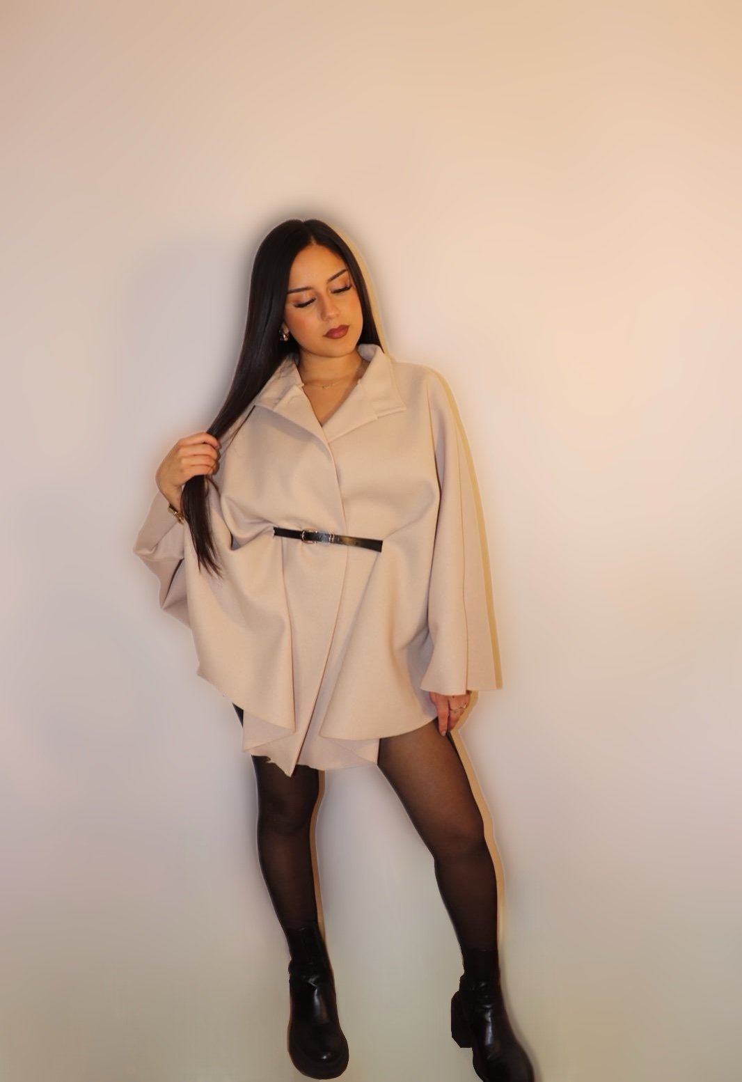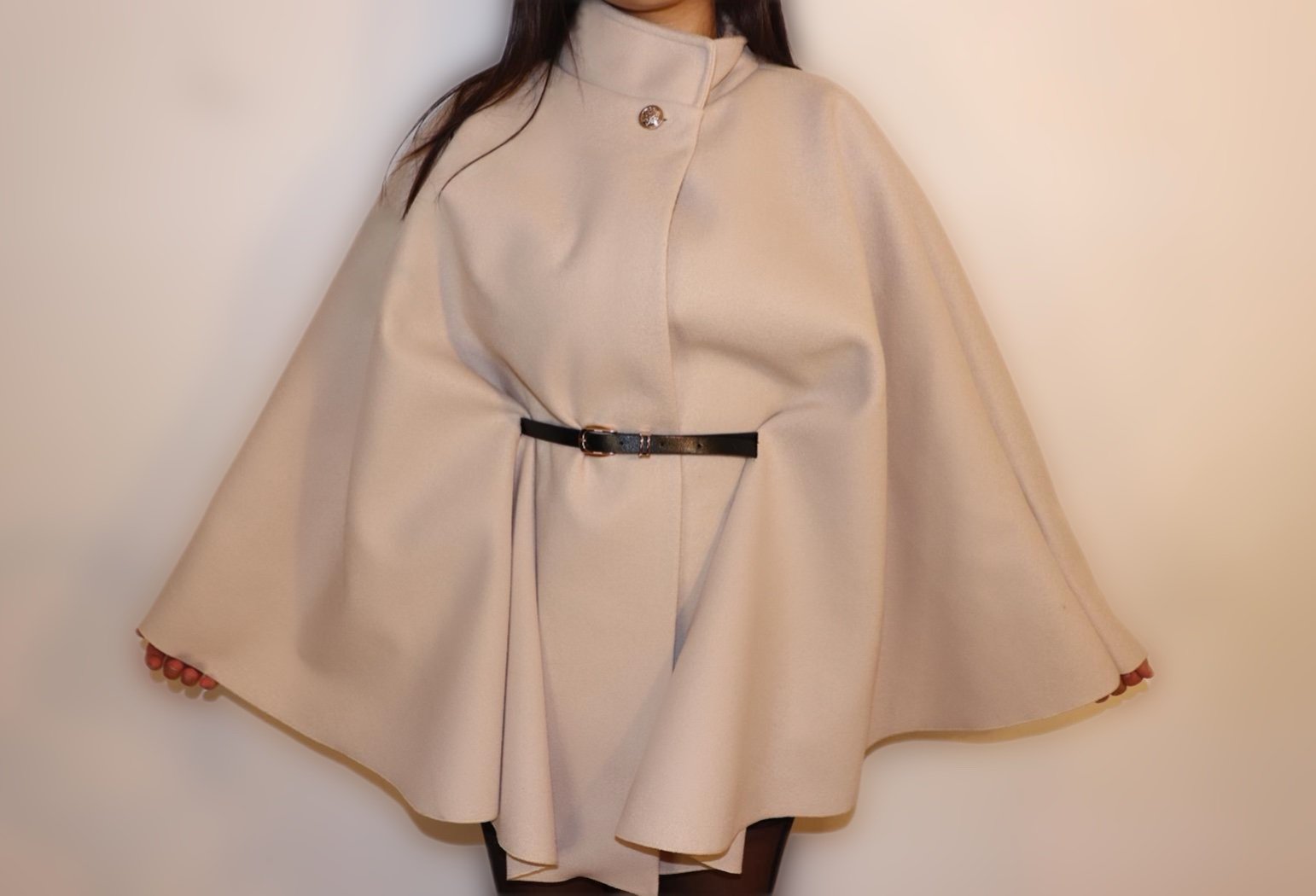 Élégante veste cape beige au tombé fluide, fermé par un bouton doré au col. Ce modèle se ceintures à la taille avec une fine ceinture noire.